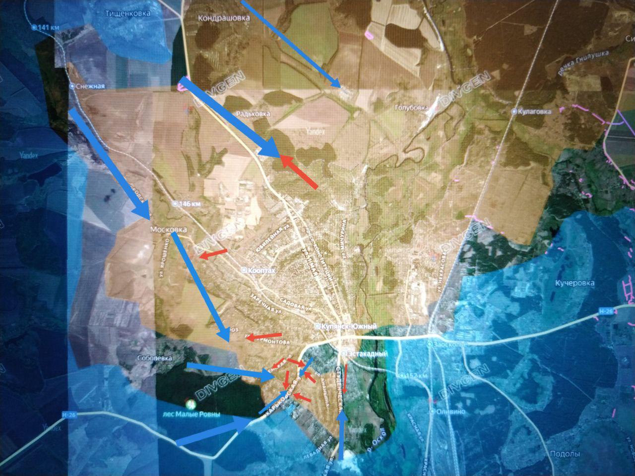 В районе Купянска противник сосредоточил дополнительные резервы и в результате контратак со стороны Московки — Соболевки и леса Малые Ромны потеснил наши подразделения севернее Купянска и в районе ул. Харьковская (Н-26) смог деблокировать свои окружённые подразделения западнее авторынка.