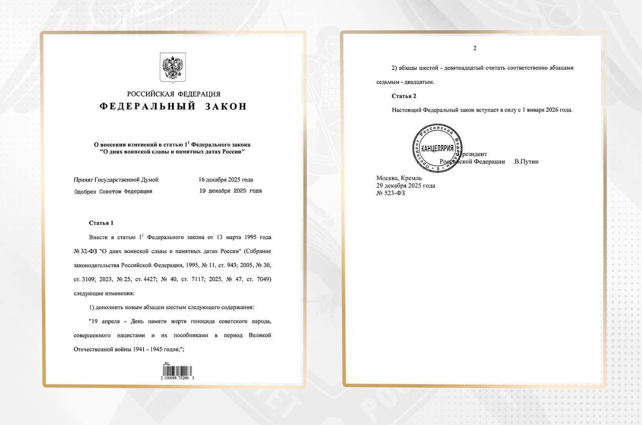 Президент Российской Федерации В.В. Путин подписал закон об установлении новой памятной даты. 19 апреля — День памяти жертв геноцида советского народа
