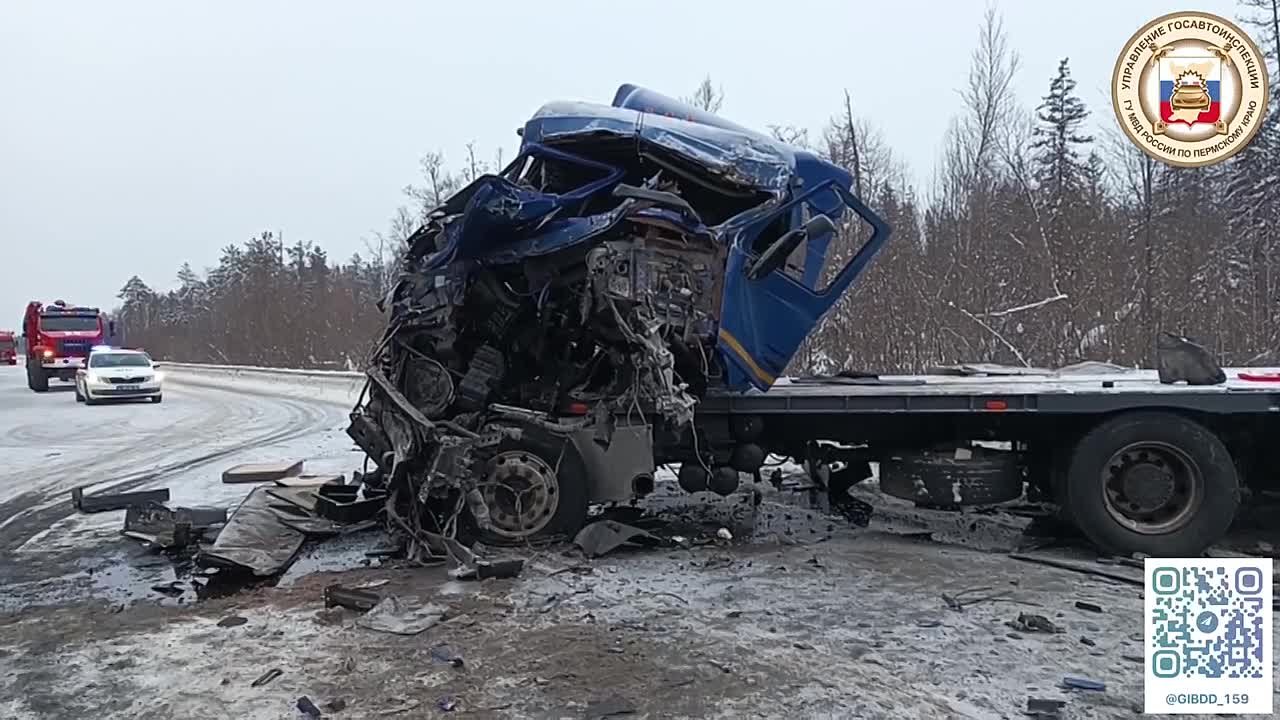 По предварительной информации, установлено что со стороны г. Нытва в направлении г. Перми двигался автомобиль «Маз», который на 1068 км по неустановленной причине выехал на полосу, предназначенную для встречного движения, где допустил столкновение со встречным автомобилем «Даф».