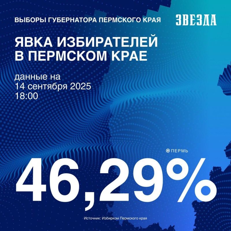 До окончания голосования на выборах губернатора Пермского края осталось менее получаса.По состоянию на 18:00 средняя явка в регионе с учётом дистанционного электронного голосования составила 46,29%, что соответствует 913 238 избирателям....