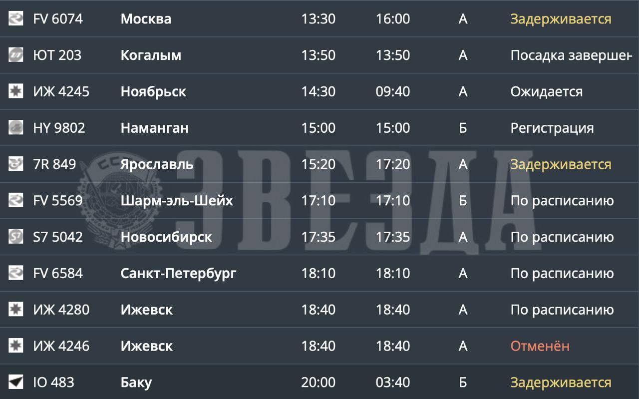 Перелет «ИрАэро» в Баку отложен до 03:40 20 октября (вместо 20:00 19 октября). Рейс «Ижавиа» в Ижевск отменен, согласно онлайн-табло воздушной гавани.