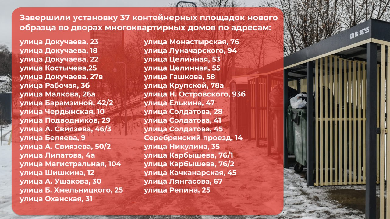 Кроме того, в частном секторе привели в порядок 178 старых площадок и построили 13 новых. Сейчас для них закупаем контейнеры. Они уже установлены в Кировском районе и в посёлке Новые Ляды, на этой неделе появятся в Дзержинском районе.