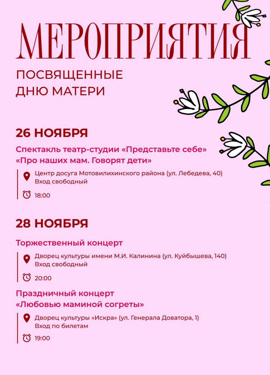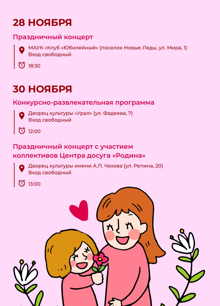 В этом году День матери выпадает на 30 ноября. В честь этого в районах города будут проходить концерты, спектакли, творческие встречи, мастер-классы, мероприятия в библиотеках и многое другое.