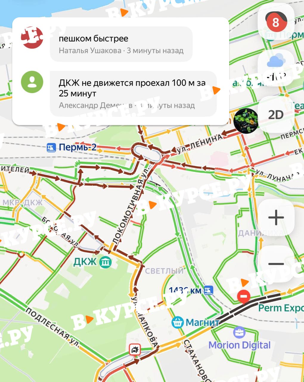 Говорят, весь транспорт города собрался сегодня утром на ДКЖ. Пермяки пишут, что пешком сегодня быстрее, а тем, кому нужно попасть на вокзал — придется бежать. Пробка не двигается.