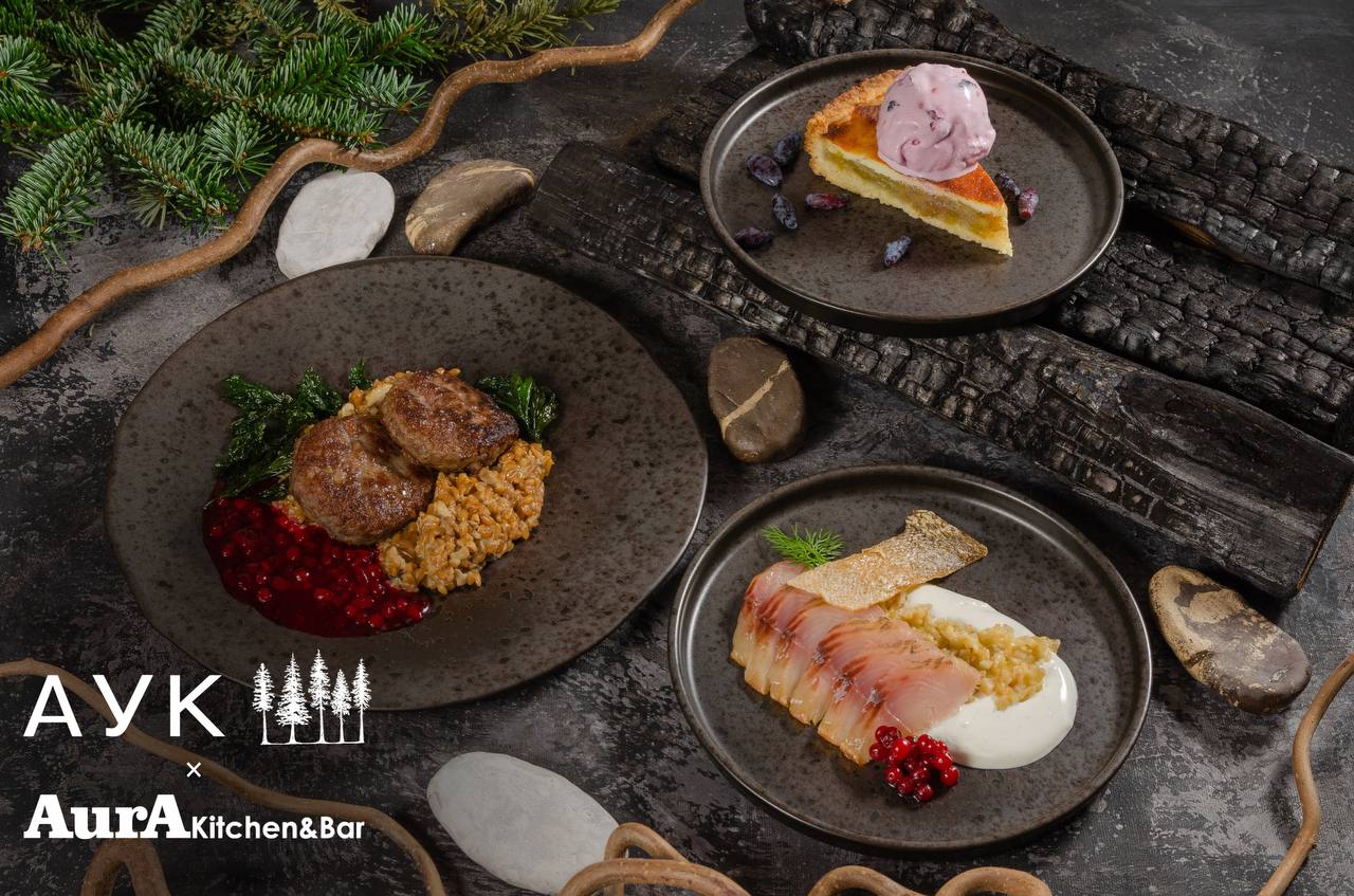 В пермском сете: копченый хариус по-уральски с моченым яблоком и брусникой, котлеты охотника с полбой и лесными грибами, и сладость — ревень, мед и жимолость.