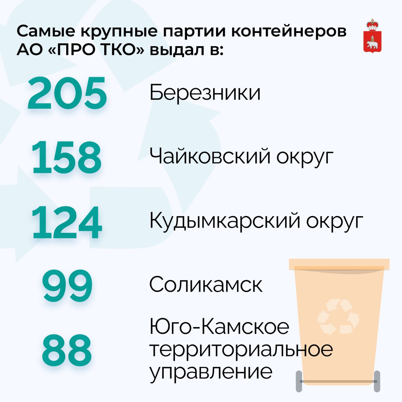 В МинЖКХ Прикамья подвели промежуточные итоги по обеспечению мест накопления отходов новыми контейнерами. В 2025 году на контейнерных площадках муниципалитетов Пермского края установлено 3 173 контейнера для ТКО — почти в два раза больше запланированной потребности на 2025 год (1 885 контейнеров). В текущем году новые контейнеры получили 37 округов.