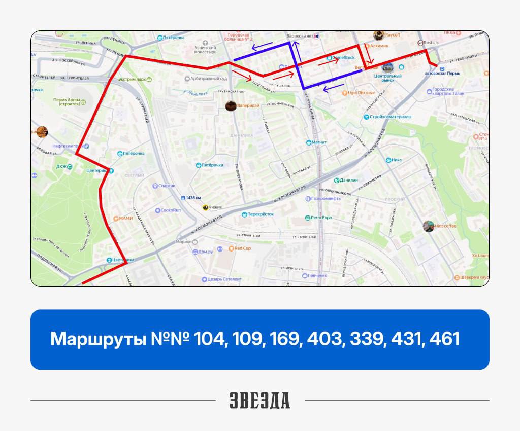 К автовокзалу от «Верхние Муллы»: Оверятская, Встречная, Куфонина, пр. Парковый, Зои Космодемьянской, Василия Каменского, Папаницев, Фридриха Энгельса, Локомотивная, Луначарского, Борчанинова, Пушкина.
