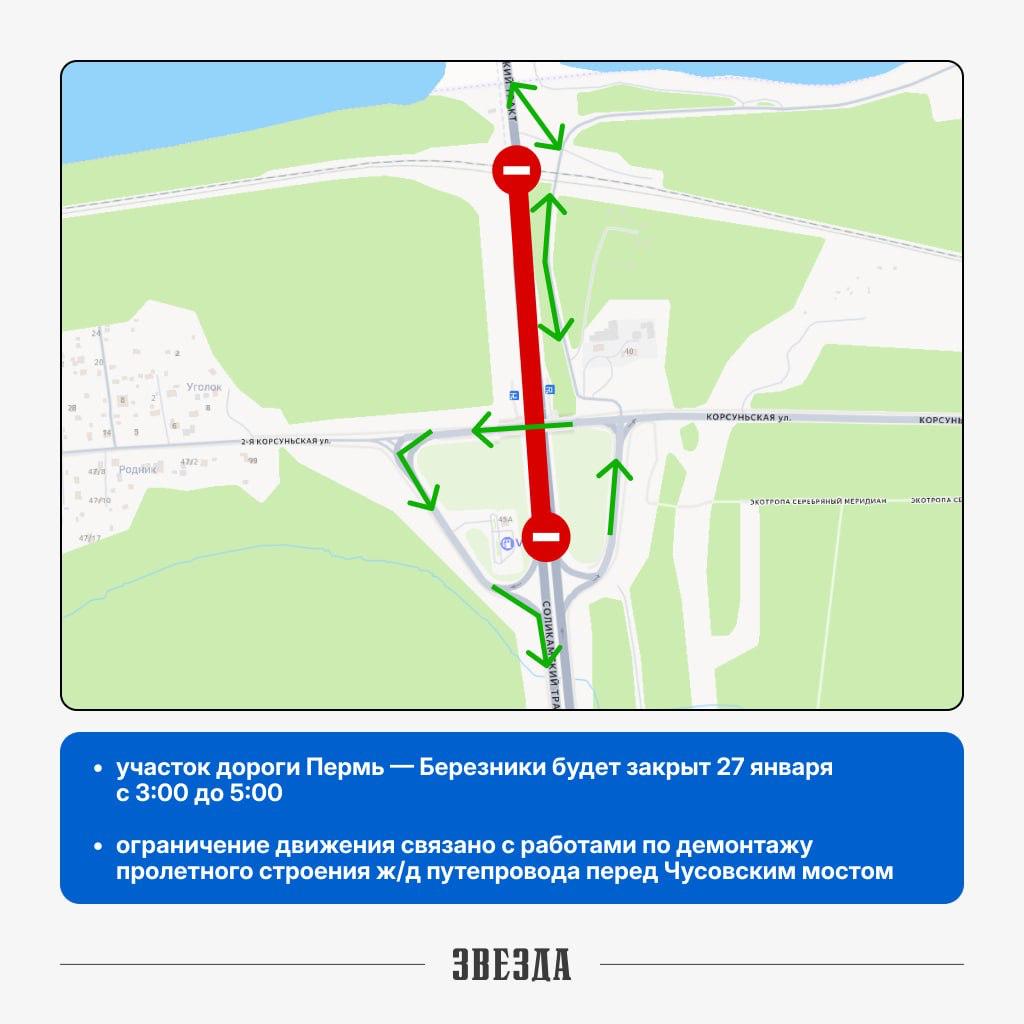 Движение на участке трассы Пермь — Березники у Чусовского моста временно закроют