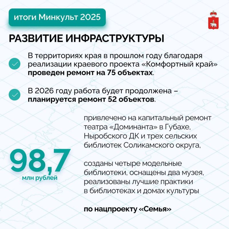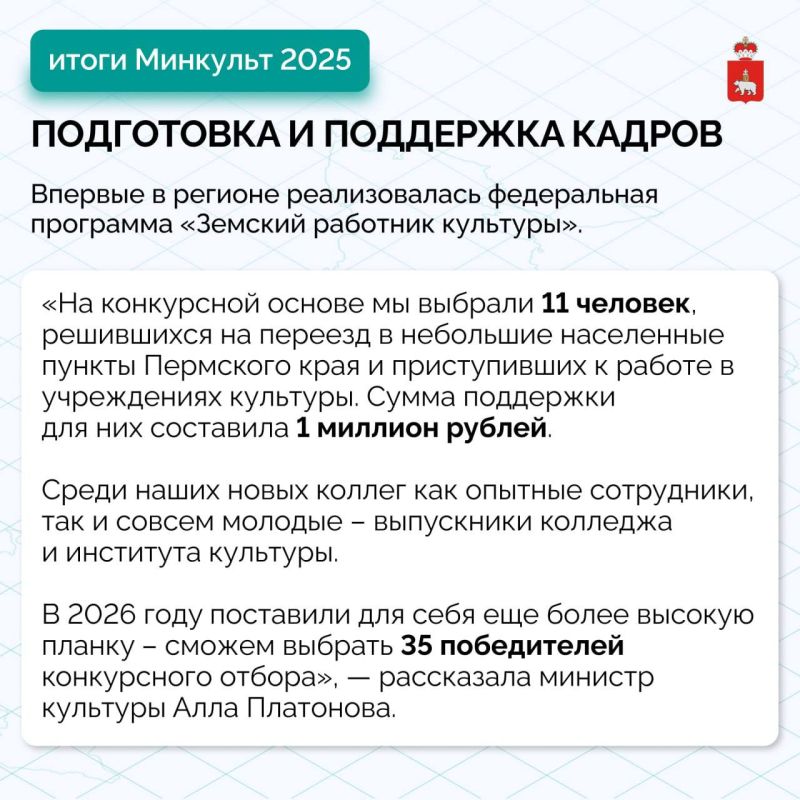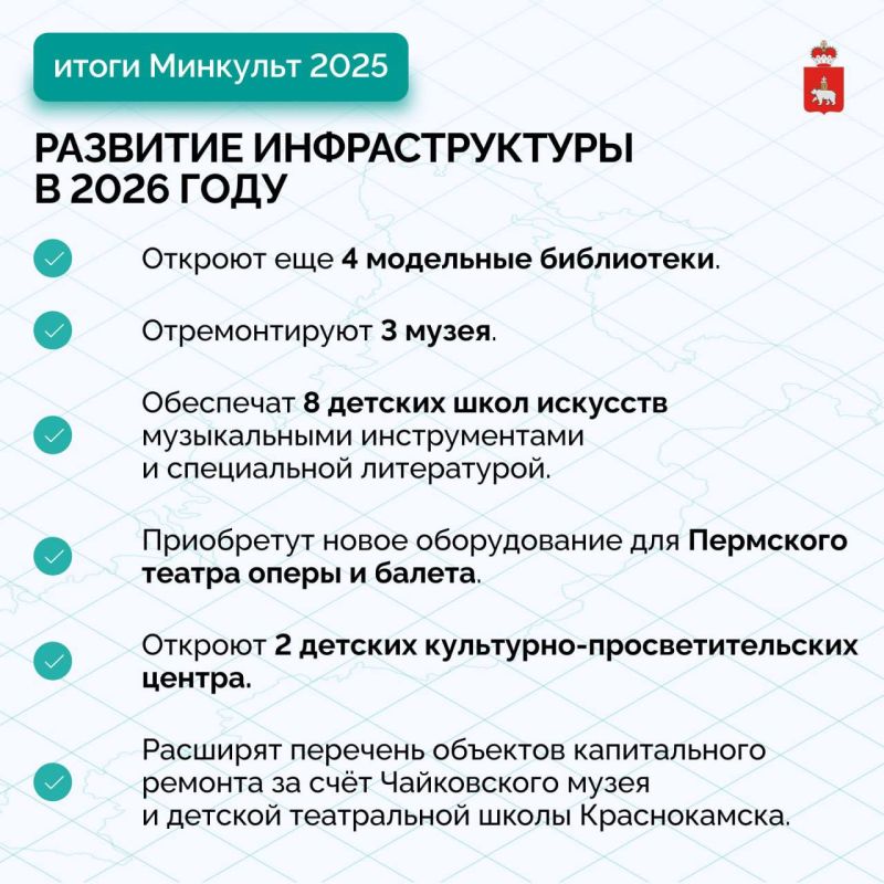 В завершении Министр культуры добавила, что 2026 год объявлен Президентом Годом единства народов России, в Пермском крае год будет посвящен Пермской промышленности. Региону предстоит отметить несколько юбилейных дат: