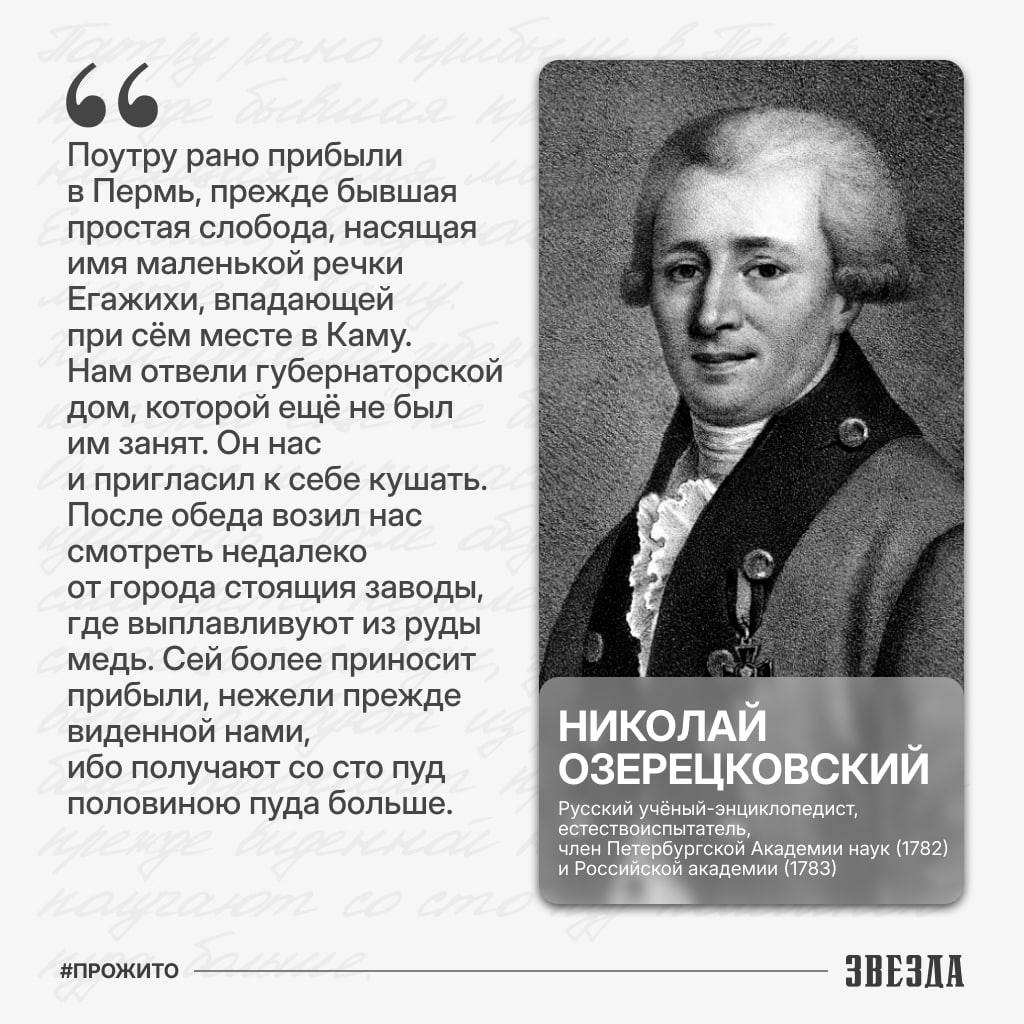 В первом посте рубрики русский учёный-энциклопедист, естествоиспытатель, член Петербургской Академии наук (1782) и Российской академии (1783) Николай Озерецковский с рассказом о посещении Перми 26 августа 1782 года.