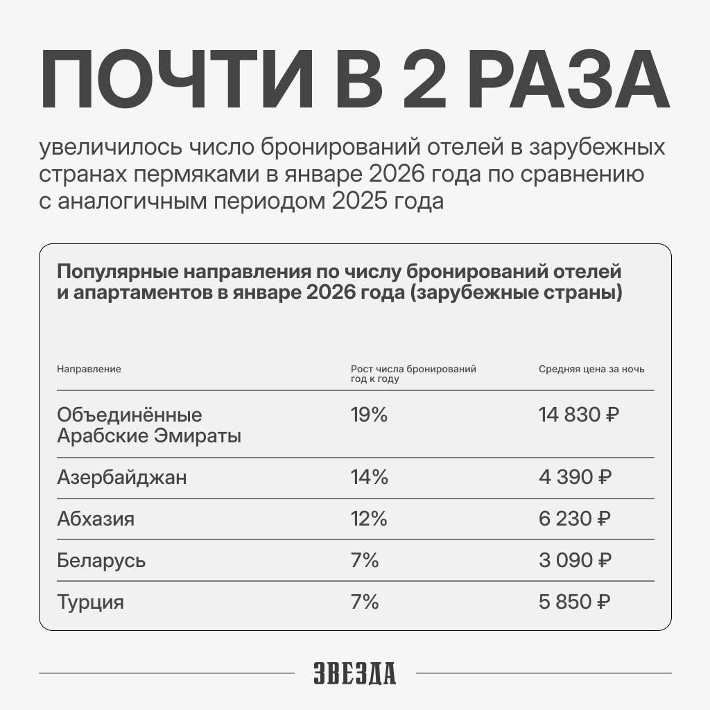 Общее число бронирований отелей и апартаментов жителями Прикамья выросло на 27% по сравнению с январем прошлого года. Основная часть путешествий пришлась на внутренний туризм, но интерес к зарубежным поездкам также заметно усилился