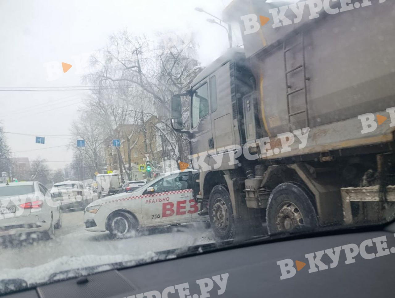 Подписчик сообщает, что все стоит наглухо. Раскопки заняли две полосы из трех, а также на этом участке сразу два ДТП. В одном из них грузовик, груженый снегом, врезался в такси.