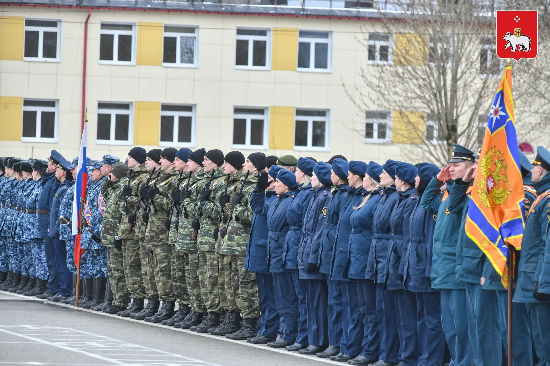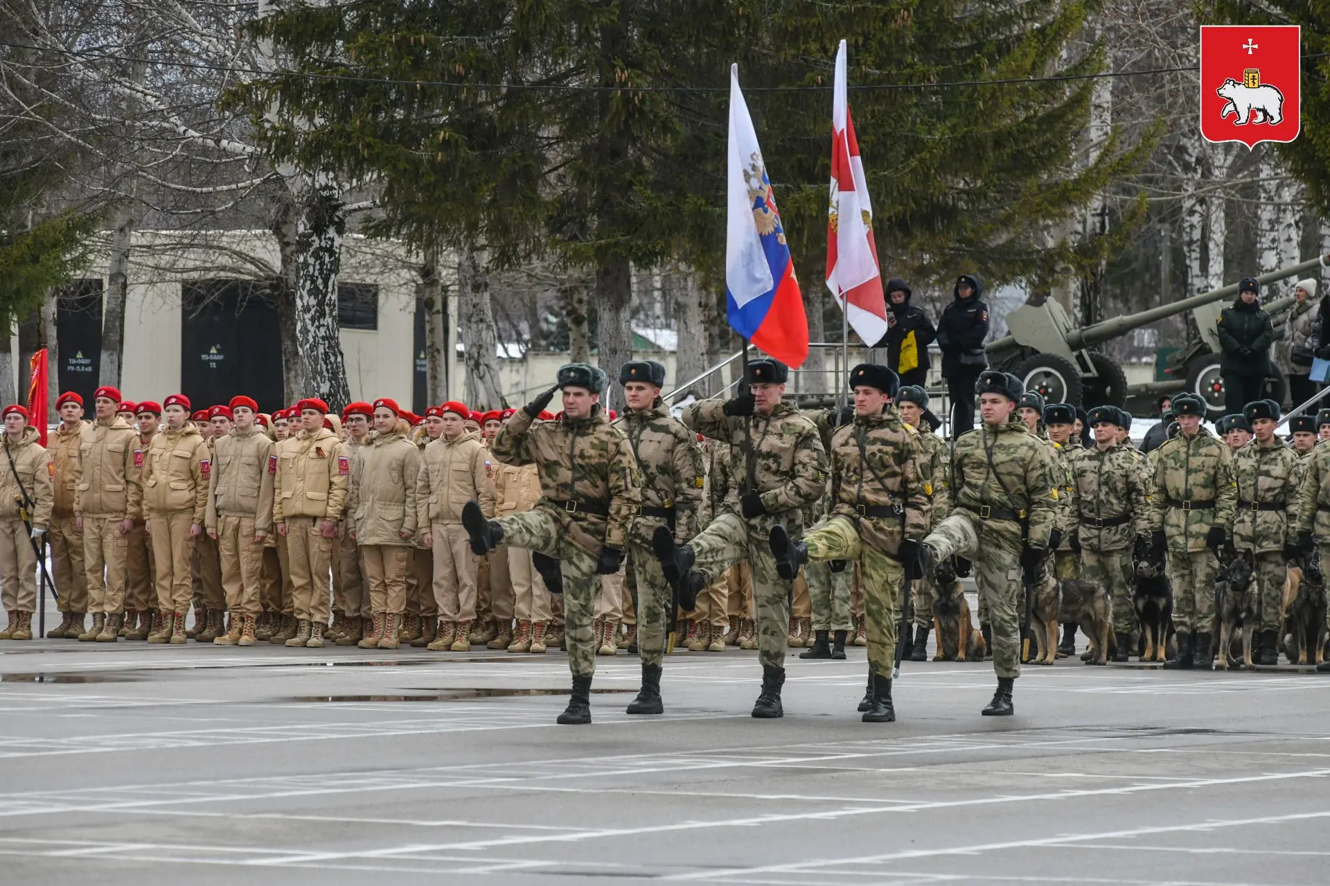 На плацу Пермского военного института уже начались репетиции Торжественного прохождения войск Пермского гарнизона: офицеры, курсанты, кинологи, кадеты и суворовцы отрабатывают строевой шаг и построение.