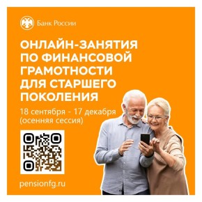 «Онлайн-занятия по финансовой грамотности для старшего поколения». Осенняя сессия проходит с 1 октября по 17 декабря. Участники узнают о формах национальной валюты РФ, освоят безопасное и эффективное использование банковских услуг, научатся выбирать...