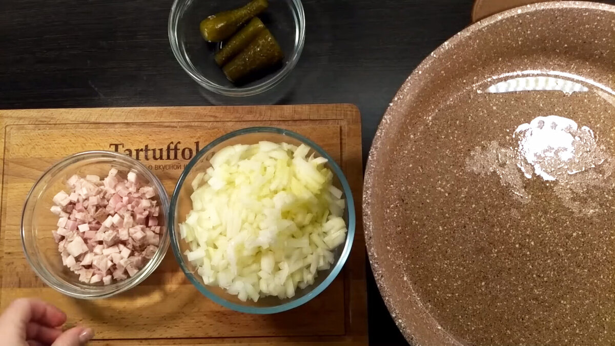 Первым делом стоит заняться начинкой. Мелко нарезанные луковицы и грудинку обжаривают на сковороде до золотистого цвета, пока лук не станет мягким. В это время в глубокой миске соединяют кефир, яйцо, соль, сахар и растительное масло, тщательно взбивая массу венчиком.