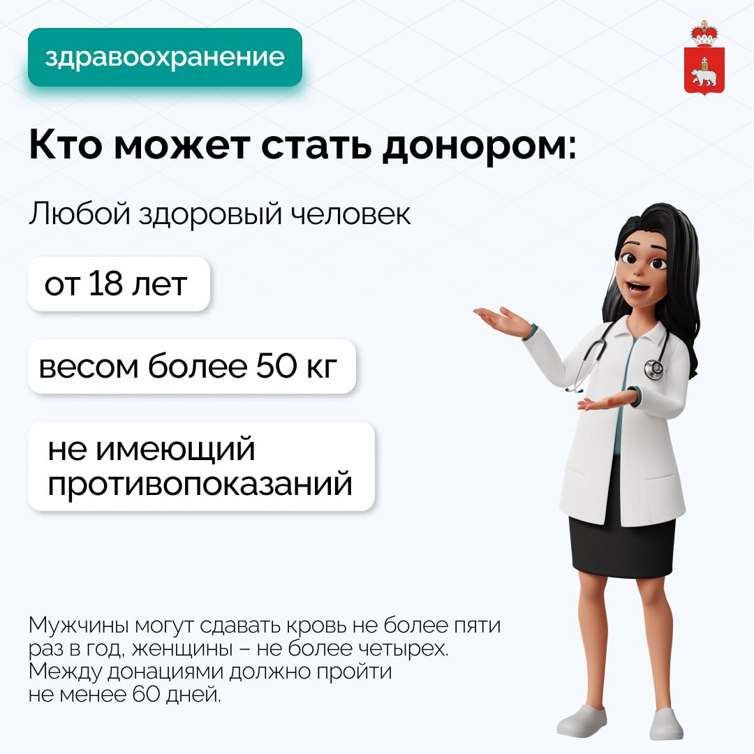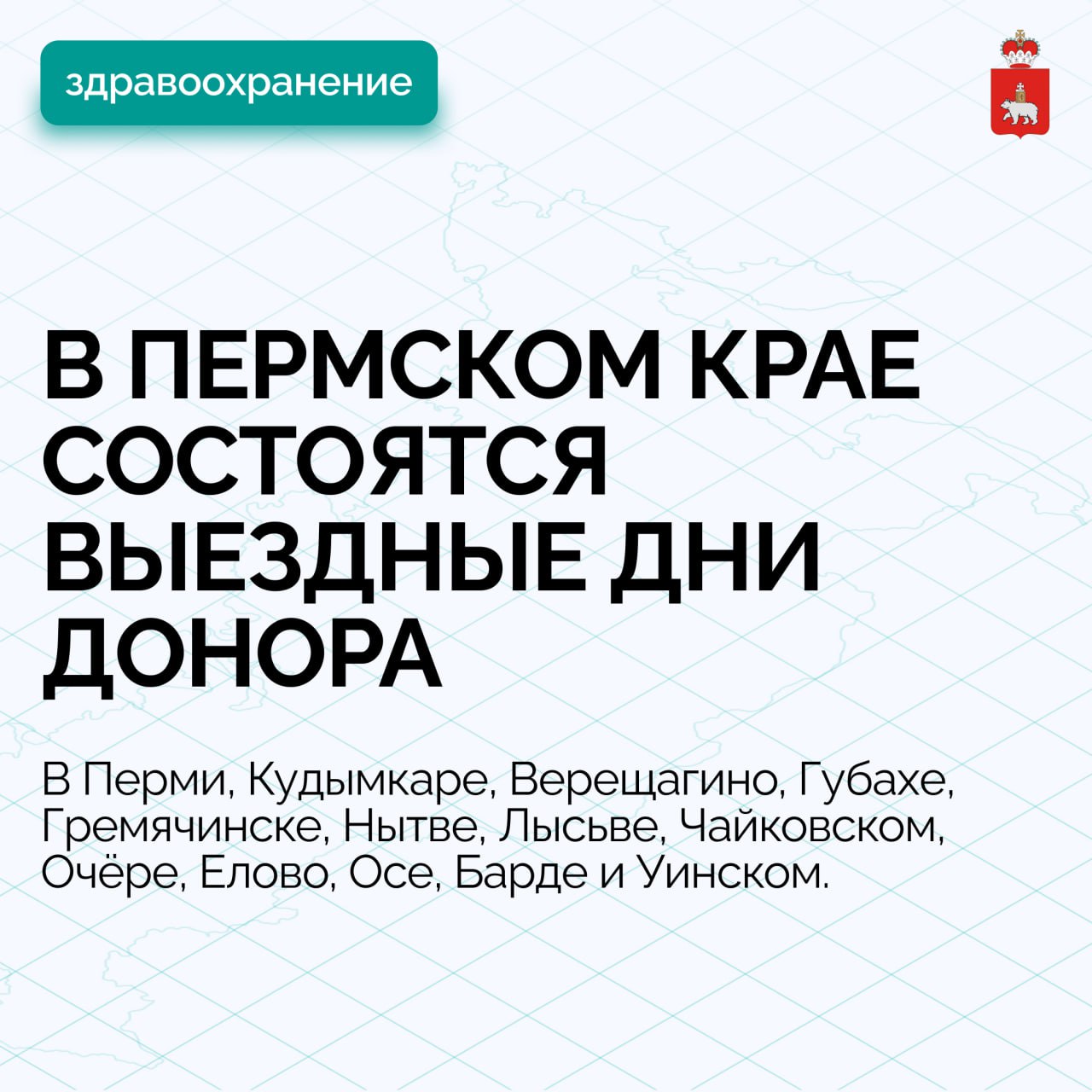 Пермская краевая станция переливания крови приглашает жителей региона стать донорами. В этом месяце выездные бригады приедут в Пермь, Кудымкар, Верещагино, Губаху, Гремячинск, Нытву, Лысьву, Чайковский, Очёр, Елово, Осу, Барду и Уинское.