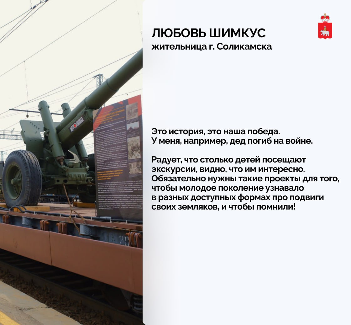 Выставочно-лекционный комплекс включал в себя 10 разных вагонов, которые наглядно иллюстрировали подвиг жителей Прикамья в тылу. Например, на одной из платформ были установлены фрезерные станки 20-х и 40-х годов. Примерно так целые заводы эвакуировали от линии фронта на восток, чтобы заново развернуть производство в тылу.На другой грузовой платформе были установлены огромные дальнобойные пушки, включая 122-миллиметровую А-19. Именная такая пушка, изготовленная на Молотовском заводе, 20 апреля 1945 года произвела первый выстрел по Берлину. За пушками — вагон-цистерна для нефти, ведь в годы войны Прикамье практически с нуля стало «вторым Баку», снабжая топливом фронт.