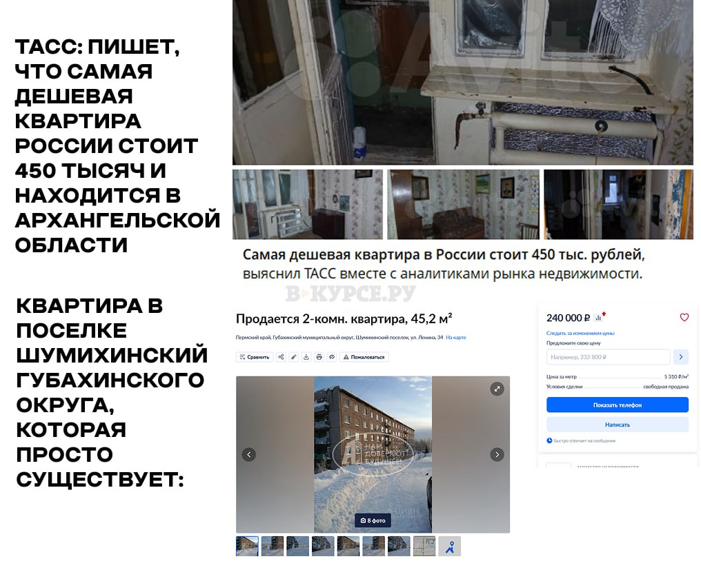 Самая дешевая квартира (по данным «Циан») в Пермском крае стоит 240 тыс. рублей