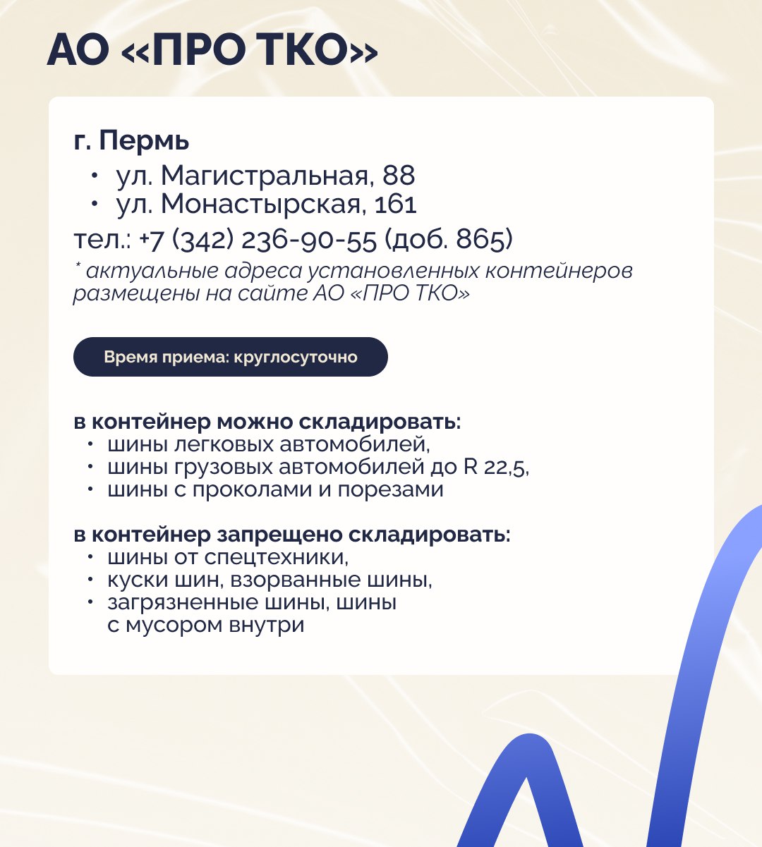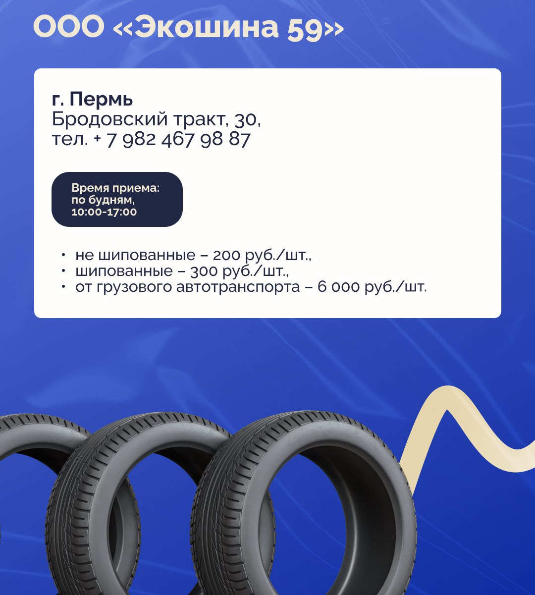 В Перми работают организации, готовые принять такие шины как за плату, так и бесплатно. В карточках указаны адреса пунктов сбора, куда можно их сдать. Также можете задать вопросы и записаться на удобное время.