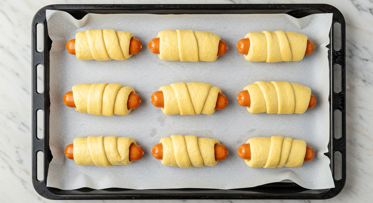 Когда тесто готово, нарежьте его полосками шириной примерно 3-4 сантиметра. Каждый кусочек должен идеально соответствовать сосиске, так что можно использовать одну полоску на одно изделие. Затем, начиная с одного конца, аккуратно заворачивайте сосиску в тесто, образуя спираль. После того как все сосиски завернуты, дайте им настояться в тепле около 15 минут — это позволит тесту подняться и стать пышнее.