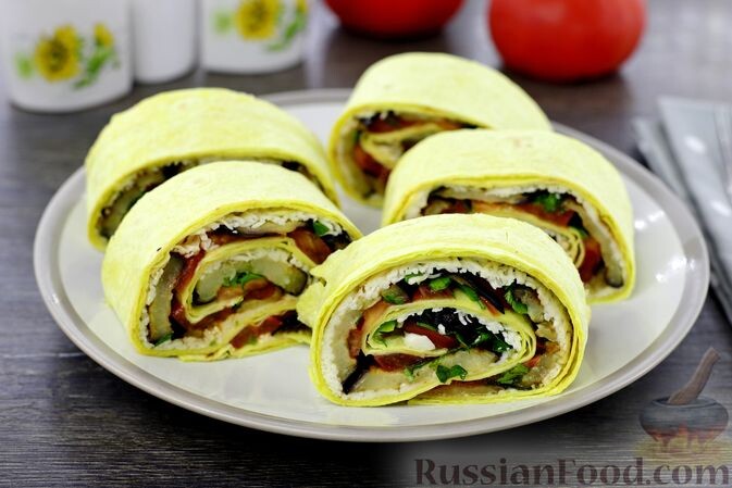 - Рулетики из лаваша с баклажанами и помидорами: Эти простые рулетики, фаршированные обжаренными баклажанами, свежими помидорами и ароматной зеленью, добавят ярких красок в ваше меню. Быстро и с минимальными затратами!