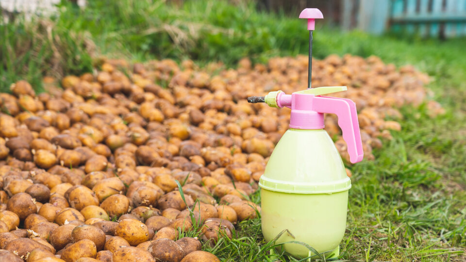 - Растворы препаратов следует тщательно перемешивать и равномерно распылять на клубни с помощью опрыскивателя. Важно покрыть все поверхности клубней.