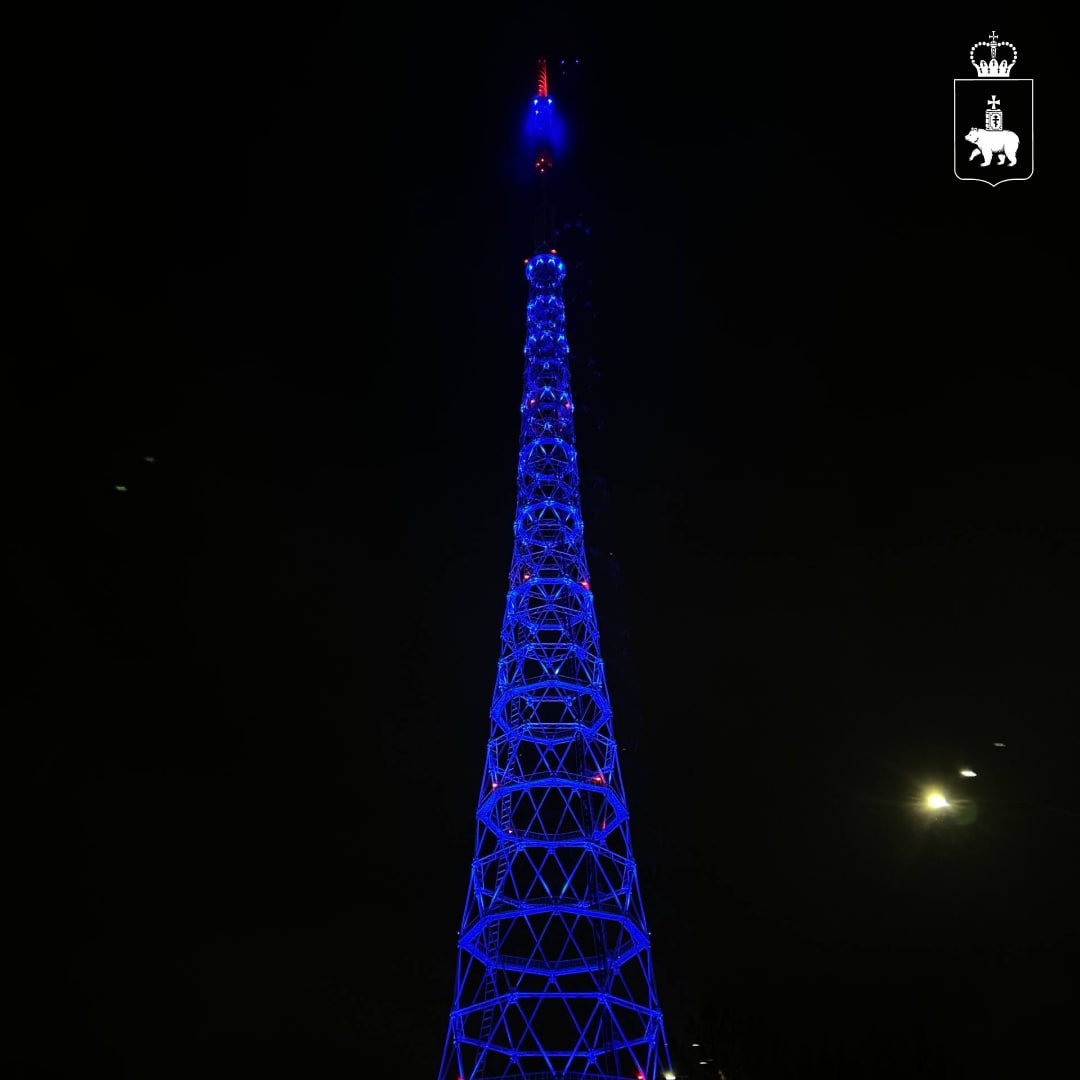 В честь десятилетия «Волонтёров Победы» 28 октября телебашня Перми окрасилась в синий цвет.
