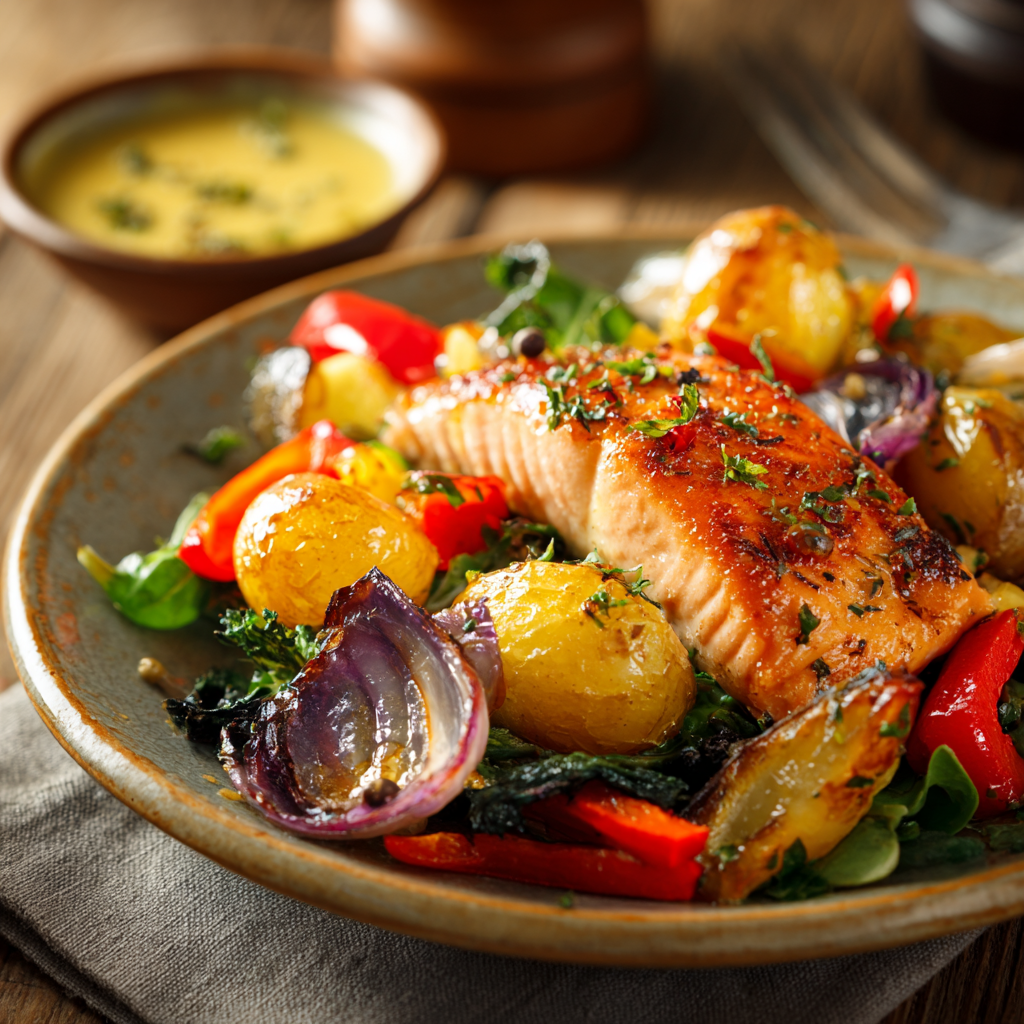 Смешайте оливковое масло, дижонскую горчицу, мед и лимонный сок — это придаст вашему салату легкую пикантность. На тарелку красиво выложите запеченные картофель и овощи, а сверху разместите лосось. Полейте заправкой и украсьте свежей зеленью.