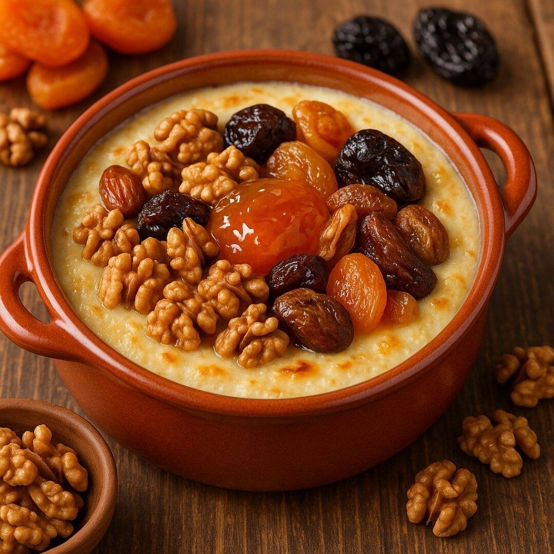 3. Приготовление и сборка: В оставшемся молоке, доведённом до кипения с добавлением соли, всыпьте манную крупу, интенсивно размешивая. Выложите кашу в глиняный горшок, переслаивая её с орехами, сухофруктами и пенками. Последний слой должен состоять из пенок и орехов.
