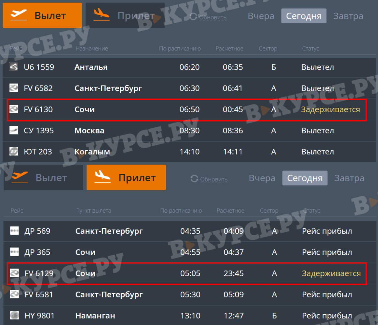 Задержки происходят из-за ночной атаки БПЛА в Сочи. По сообщениям Росавиации, аэропорт Сочи возобновил работу в 8 утра, но ночные рейсы ещё не выполнены.