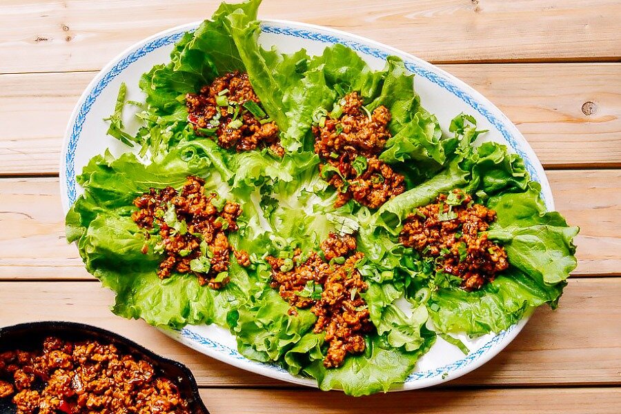 Лук нарезать небольшими кубиками, а чеснок измельчить. Чили перец и зеленый лук следует нарезать.Листья салата аккуратно разобрать и красиво выложить на тарелку.В небольшой миске развести кукурузный крахмал в нескольких столовых ложках воды для загустения соуса.В глубокой тарелке соединить все ингредиенты для соуса и тщательно перемешать.На средне-разогретой сковороде с растительным маслом обжарить лук, чили и чеснок до полупрозрачности лука.Сдвиньте обжаренные ингредиенты к краю сковороды, добавьте куриный фарш. Обжарьте его в течение нескольких минут, разбивая на кусочки.Смешайте фарш с луком и добавьте подготовленный соус. Тушите пару минут.Перед добавлением разведенного крахмала убедитесь, что он хорошо перемешан, а затем влейте в сковороду, постоянно помешивая до загустения соуса.Снимите с плиты и аккуратно выложите начинку на листья салата. Посыпьте сверху нарезанным зеленым луком для свежести и красоты.Подача блюда на листах салата привнесет дополнительные нотки свежести, и оно станет идеальным угощением для ваших близких. Не стесняйтесь экспериментировать с соусами и добавлять другие овощи по вашему вкусу. Приятного аппетита!