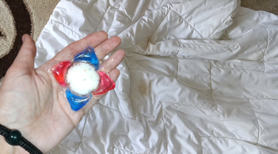 Если на одеяле есть пятна, их можно обработать специальными пятновыводителями или смешанным раствором из моющего средства и соды. Также важно помнить, что сушить одеяло на батарее категорически не рекомендуется, чтобы не повредить наполнитель. Внимательно изучите ярлык одеяла — на нём указаны рекомендации по уходу.