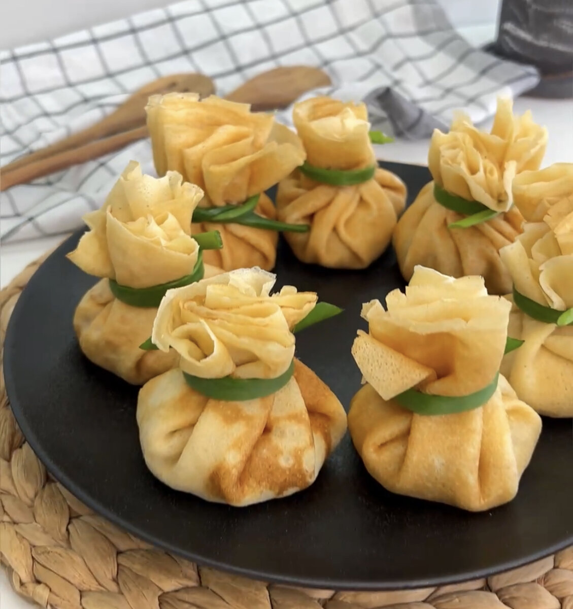 После того, как блины и начинка готовы, каждый блин наполняется начинкой и собирается в аккуратный мешочек. Луковое перо может стать отличным способом закрепить блин, но также можно свернуть его в конверт – это удобно и стильно. Подавайте блины на стол и наслаждайтесь нежным вкусом, который обязательно понравится всем.
