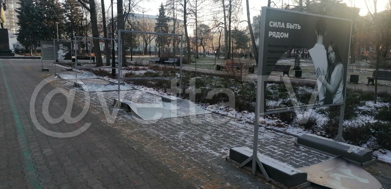 Неизвестные повредили несколько информационных щитов экспозиции «Сила быть рядом» в сквере возле Театр оперы и балета. Фотовыставка посвящена детям-сиротам, на информационных щитах были изображены подопечные благотворительной организации «Солнечный круг» и их наставники.