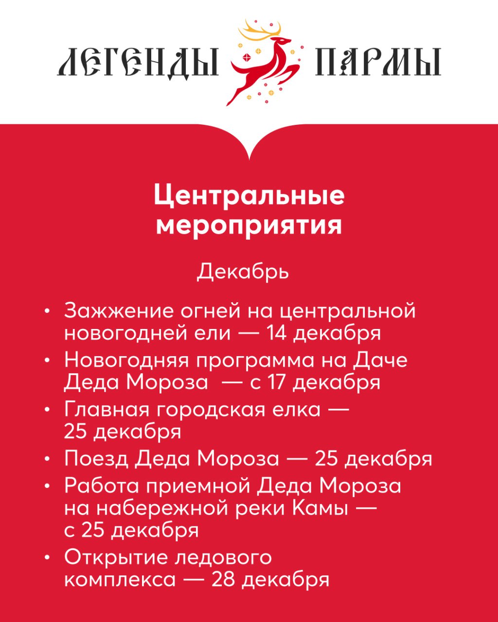 В этом году праздничные мероприятия будут посвящены «Легендам Пармы». На эспланаде появится главный ледовый городок, который будет оформлен в стиле произведений уральских авторов, таких как Павел Бажов и Дмитрий Мамин-Сибиряк, а также вдохновлен образами коми-пермяцкого эпоса.