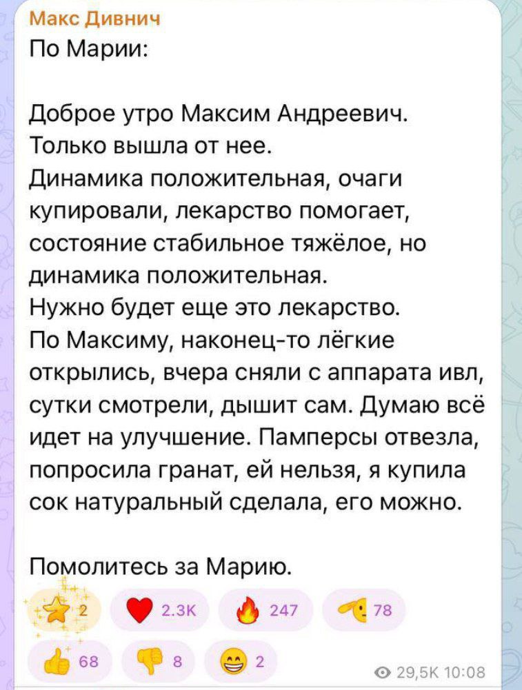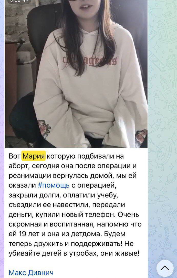 Последние несколько месяцев боец ММА занимался сборами средств с аудитории для некой 18-летней сироты Марии, которую злые врачи якобы заставляли сделать аборт. На его канале была целая череда публикаций про тяжёлое состояние девушки и её новорожденного ребёнка. Скрины взяты отсюда, так как Макс Дивнич почему-то сделал свой канал приватным.