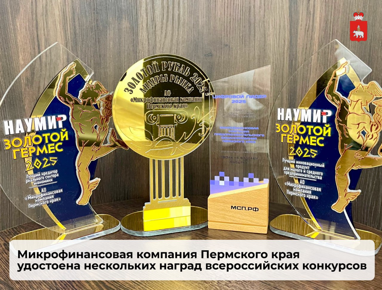 По итогам работы за 2025 год Национальная ассоциация участников микрофинансового рынка «НАУМИР» объявила Микрофинансовую компанию Пермского края победителем профессиональной премии «Золотой Гермес» в номинациях «Лучший кредитор реального сектора экономики» и «Лучший инновационный продукт для малого и среднего предпринимательства». Экспертное жюри высоко оценило достигнутые результаты деятельности компании по нескольким критериям.