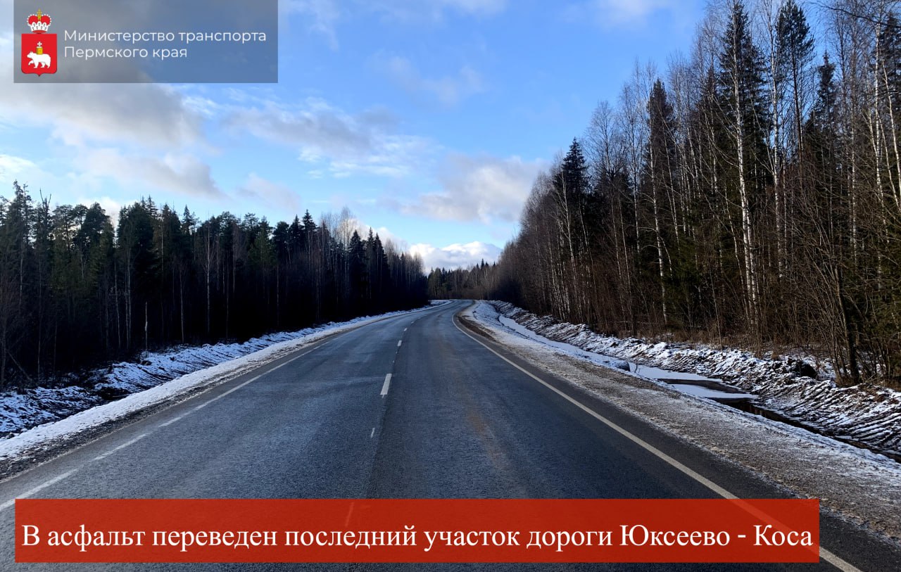 В Пермском крае в асфальт перевели последний участок региональной дороги Юксеево – Коса. Теперь дорога длиной 38 км полностью заасфальтирована.