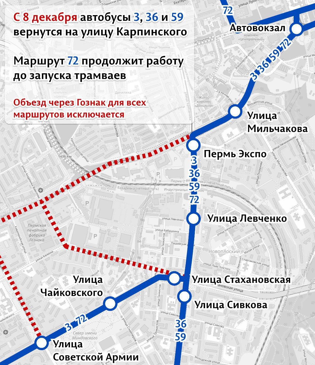С 8 декабря на этот участок вернутся маршруты №3, №36 и №59, а также временный автобус №72 – он продолжает работу до полного восстановления трамвайного движения. Остановки «Улица Снайперов», «Улица Баумана», «Печатная фабрика Гознак», «Манеж Спартак» и «Улица Блюхера» перестанут обслуживаться этими маршрутами.
