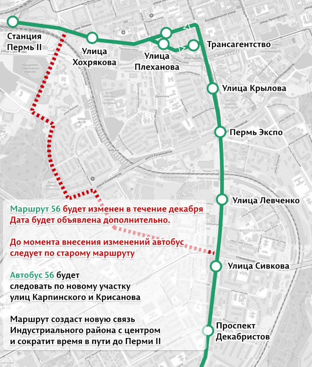 В течение декабря автобус №56 начнёт курсировать по улицам Карпинского и Крисанова. Новый путь следования позволит охватить новые остановки и сократить время в пути до Перми II. Дата изменения маршрута будет объявлена позже.