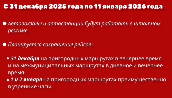 С 31 декабря 2025 г. по 11 января 2026г. в Пермском крае изменится расписание междугородных и пригородных автобусов. В связи с новогодними праздниками и изменением пассажиропотока многие маршруты переведут на выходной, праздничный или субботний график. Все изменения можно посмотреть и скачать ТУТ.