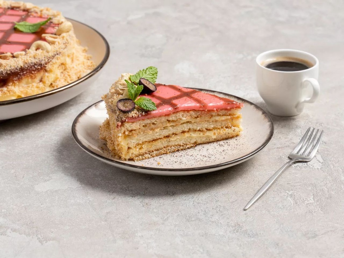 Соберите торт, промазав все коржи кремом, и украсьте поверхность орехами. Обжаренные остатки теста измельчите в крошку и посыпьте ею бока торта. Оставьте пропитываться в холодильнике минимум на 4 часа, и он будет готов к подаче — нарезанный на порционные куски, этот торт станет отличным дополнением к чаю или кофе.