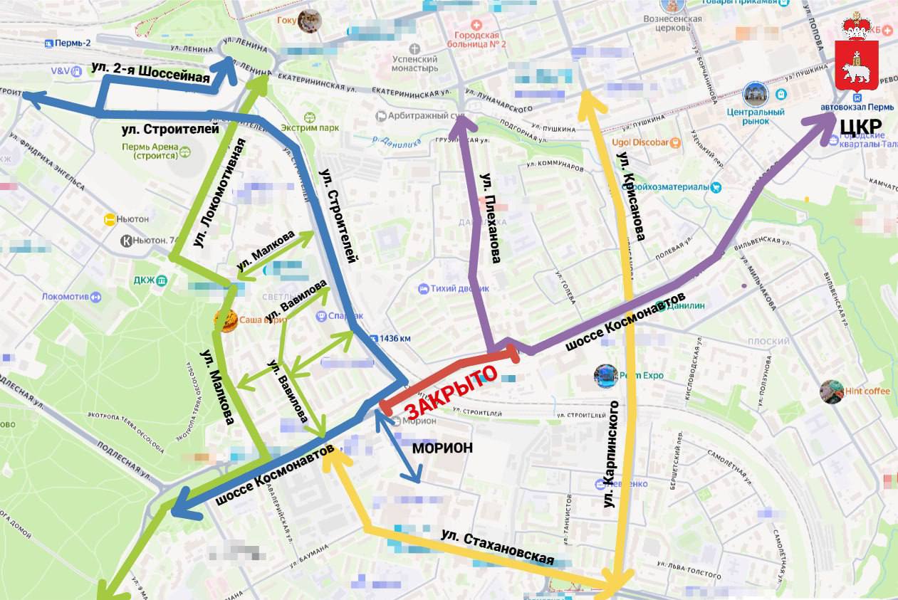 Сделали для вас новую схему со всеми возможными путями объезда закрытого участка. Объезд возможен по улицам Крисанова, Карпинского, Стахановской, Локомотивной, Малкова, Строителей и Плеханова.
