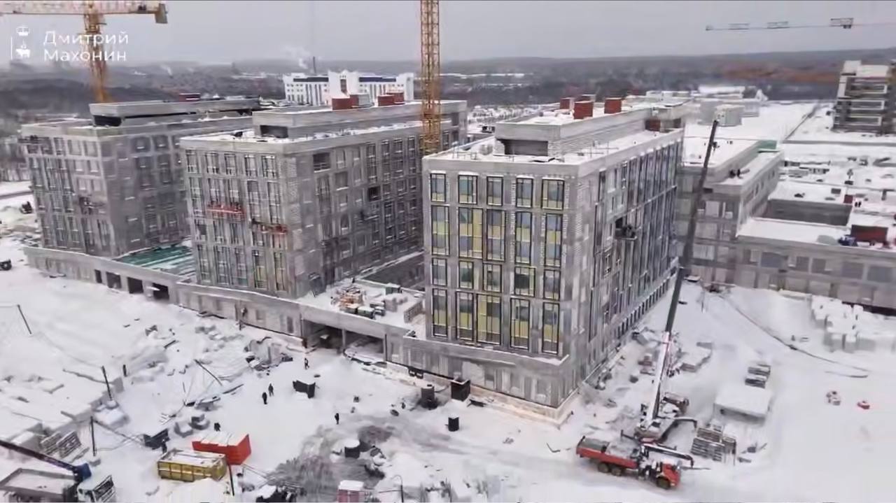 Каркас всех зданий уже возведен, запущена котельная, подано тепло во все корпуса. Сейчас ведется монтаж витражей, вентилируемого фасада и инженерных систем, внутренние отделочные работы. Также начато благоустройство прилегающей территории.