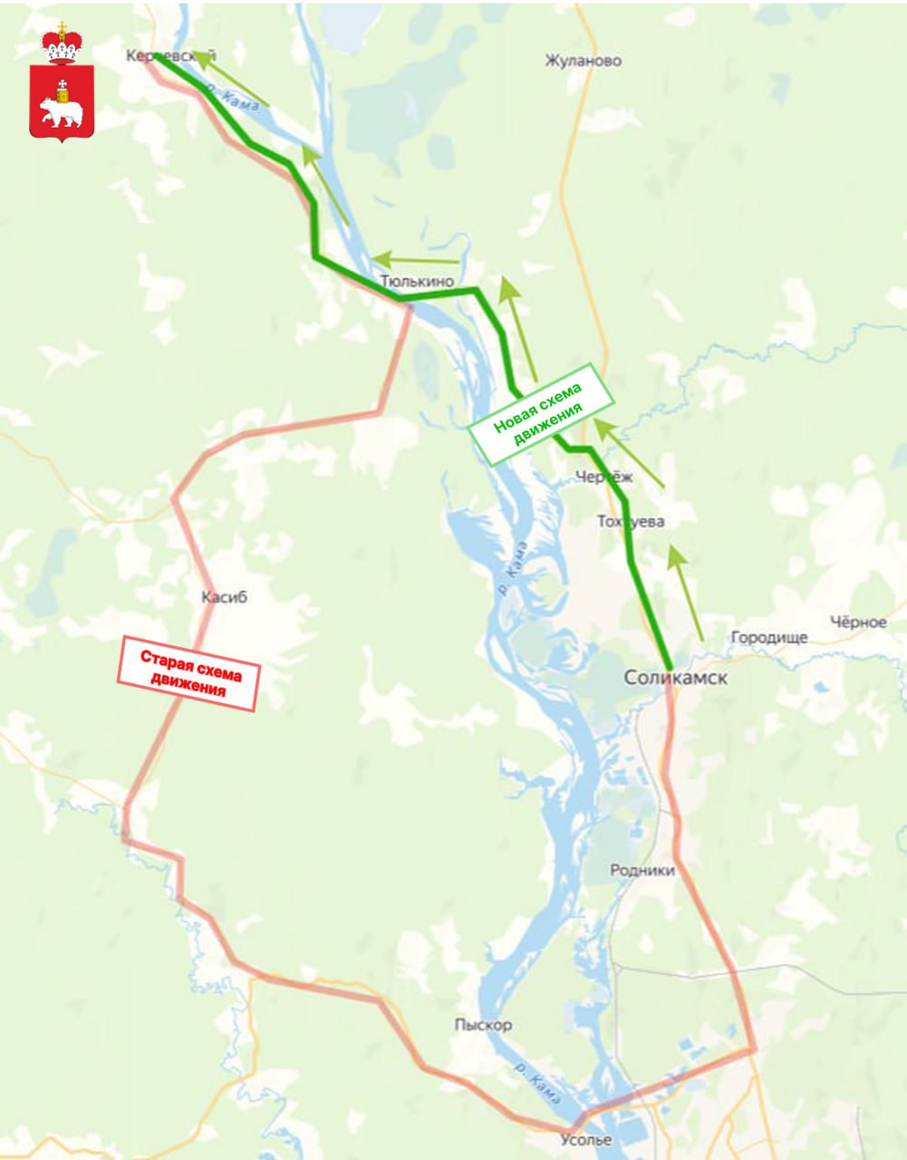 С 14 января поменяется схема движения маршрута № 545 «Соликамск – Керчевский». В связи с поднятием тоннажности ледовой переправы до 35 тонн автобусы будут курсировать через д. Тюлькино по переправе (Новый маршрут отмечен зеленым цветом).