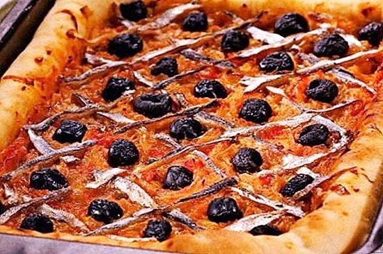 Теперь настало время подготовить анчоусы: разрежьте их на тонкие полоски. После того как тесто поднялось, раскатайте его и поместите на противень. Равномерно распределите остывшую начинку, красиво выложите анчоусы и половинки маслин сверху. Выпекайте в разогретой духовке на протяжении 30 минут до золотистого цвета.