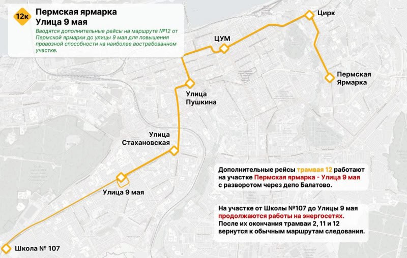 На трамвайном маршруте №12 по будням вводятся дополнительные укороченные рейсы на участке от остановки «Пермская ярмарка» до улицы 9 Мая в связи с высоким пассажиропотоком на направлении. Параллельно будет скорректировано расписание трамвайных маршрутов №4, №5 и №7 для выравнивания интервалов.