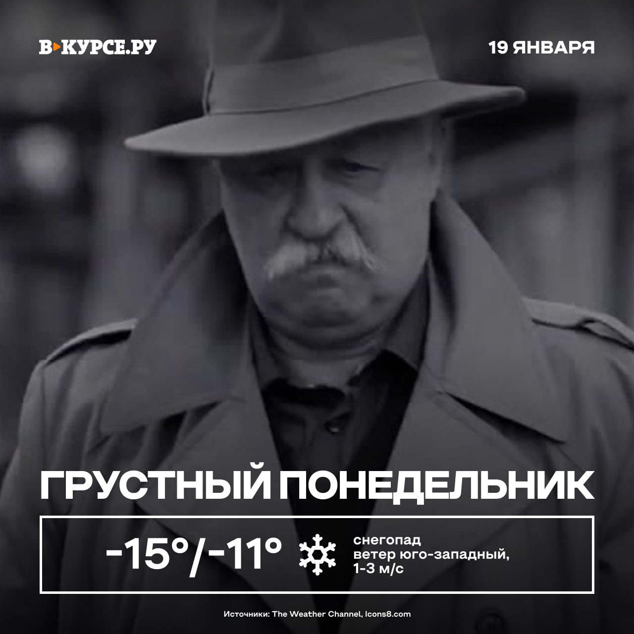 Доброе утро! Сегодня будет снегопад, температура воздуха до -11 градусов и юго-западный ветер.
