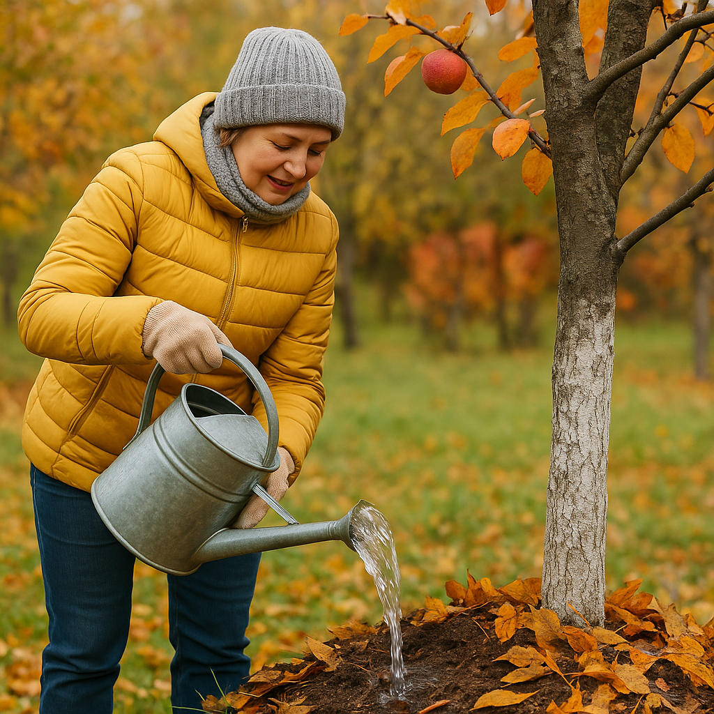 - Влагозарядковый полив. Перед наступлением заморозков необходимо полить деревья и кустарники. Даже осенью корни продолжают функционировать, и дополнительная влага поможет им легче перенести зимовку. Рекомендуется использовать 2–3 ведра воды на яблони и одно ведро на смородину.