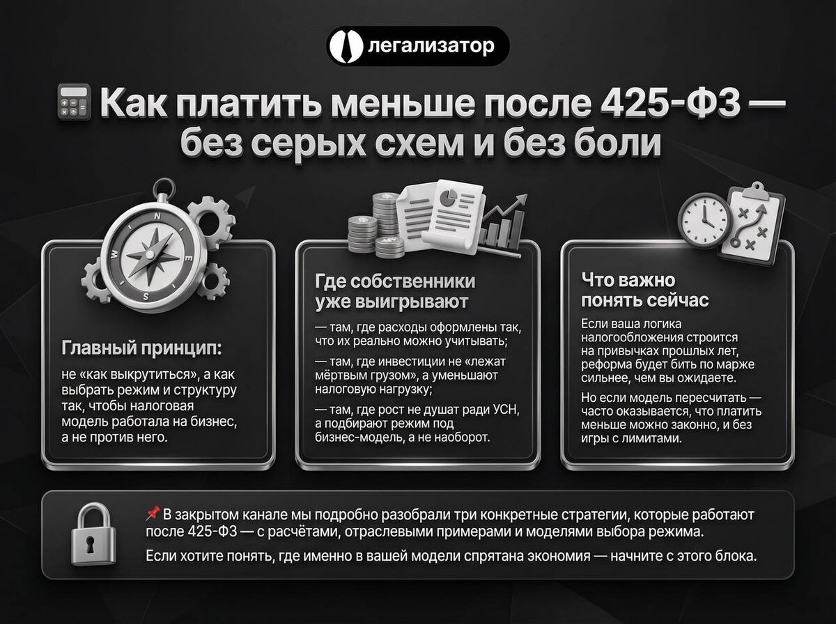 Ключевое правило заключается в том, что вместо того чтобы искать лазейки в законах, необходимо выбрать правильный режим налогообложения и структуру бизнеса, чтобы обеспечить максимальную выгоду.